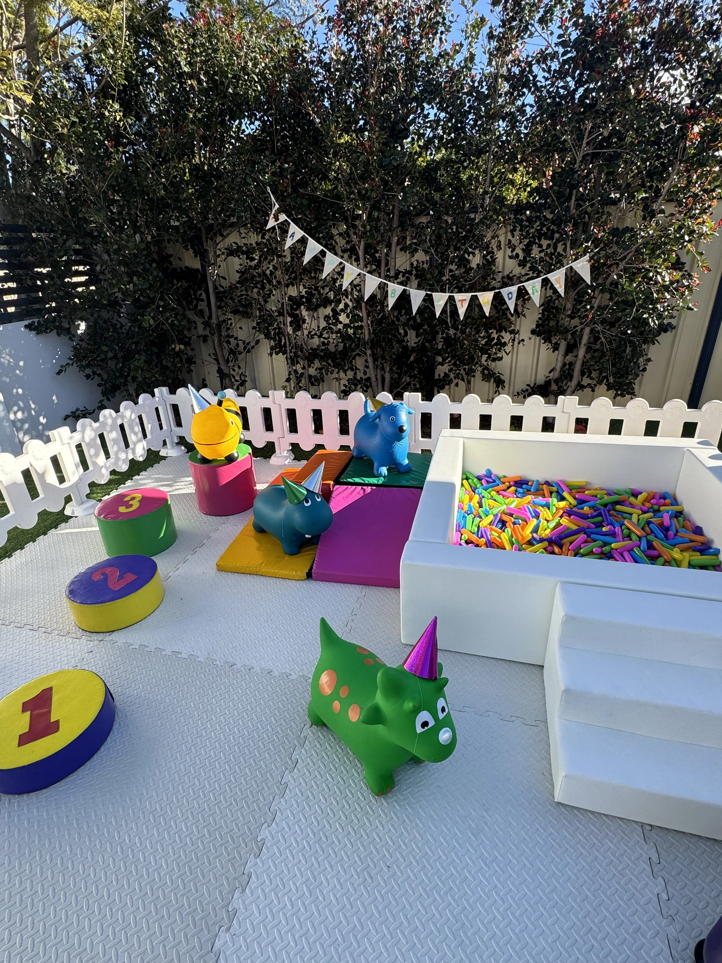 Includes: 1.5m Pastel Ball Pit, Pastel Steps, White & Pastel Balls, Teepee with Soft Rugs & Cushions, 5 Piece IGLU Pastel Soft Play, 3 Bouncy Unicorns, Mats to cover 4m x 3m