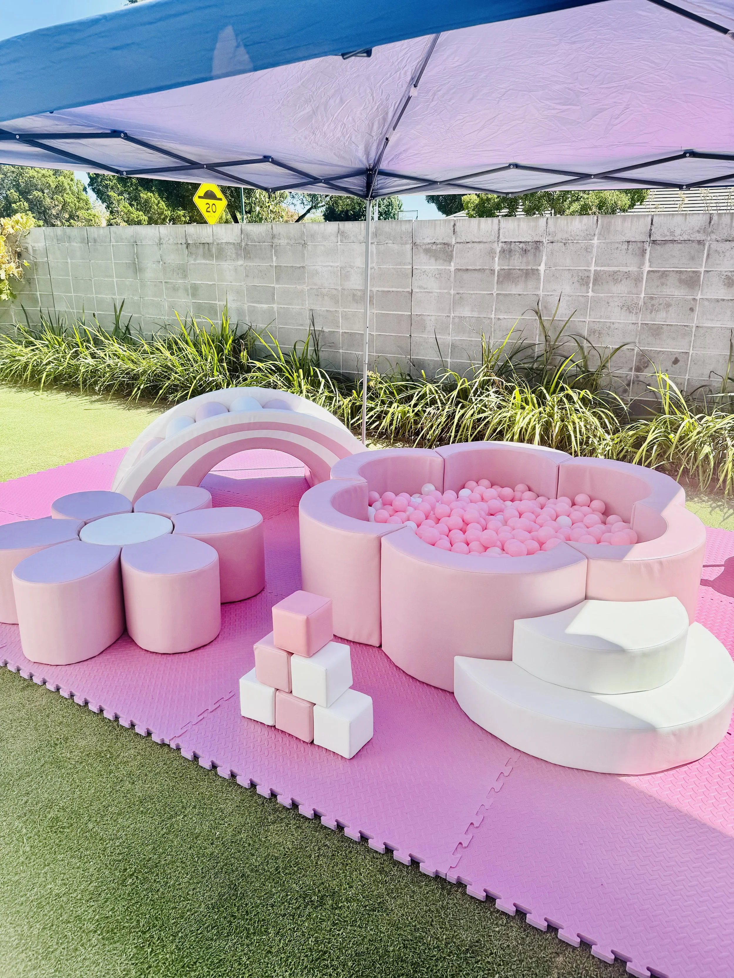 Includes: 1.5m Pastel Ball Pit, Pastel Steps, White & Pastel Balls, White Teepee with Soft Rugs & Cushions, 1 Large Pastel Play Set, Please see individual items for measurements, Mats to cover 4m x 3m