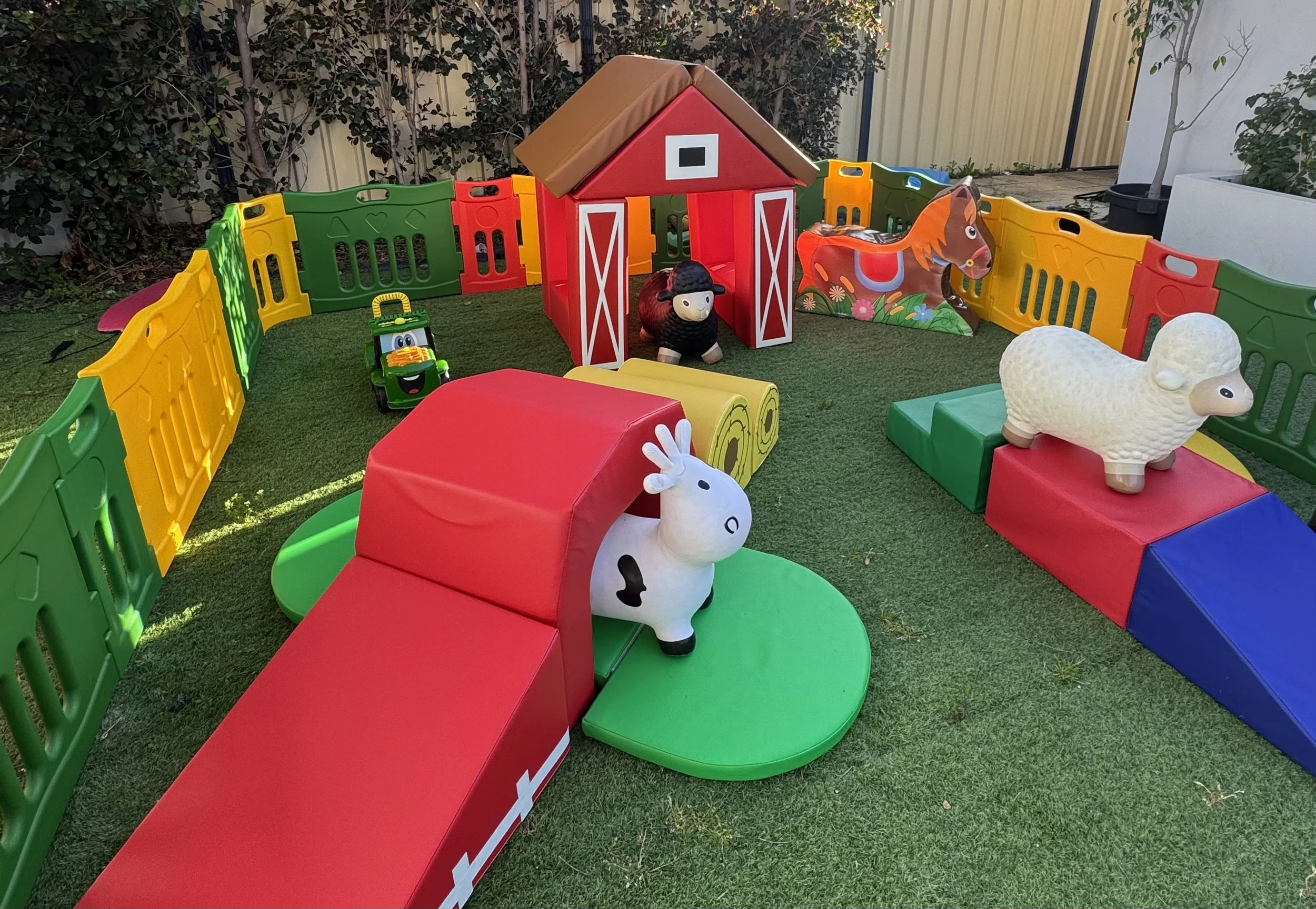 Includes: Open Playpen Fencing 3m across back & sides, Red Soft Play Barn, 3 Piece Soft Step & Slide, Large Soft Pony, 2 Barnyard Bouncy Animals, Red Tunnel with Faux Hay Barrels, 1 John Deere Tractor